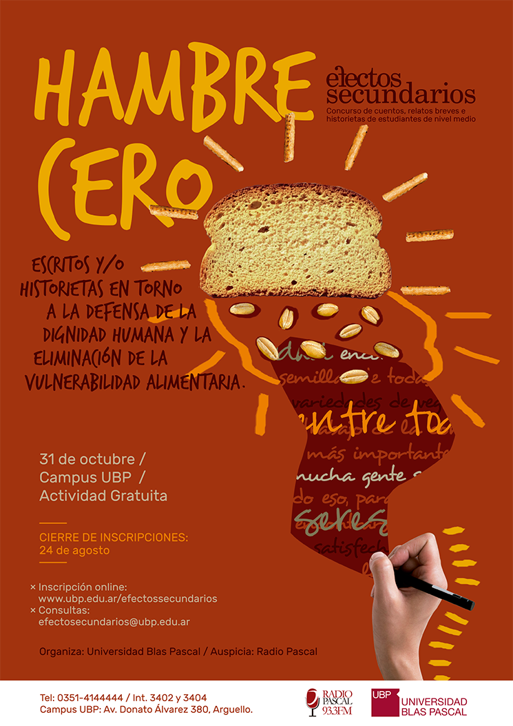 La Secretaría de Extensión y Relaciones Institucionales de la Universidad Blas Pascal te invita a participar, en representación de tu colegio, de "Hambre Cero: un camino hacia el fin del hambre" doble concurso de cuentos y relatos breves e historietas de estudiantes de nivel medio, cuya publicación impresa se presentará el 31 de octubre de 2018 en el Campus de la Universidad Blas Pascal, Av. Donato Álvarez 380, Argüello, Córdoba.